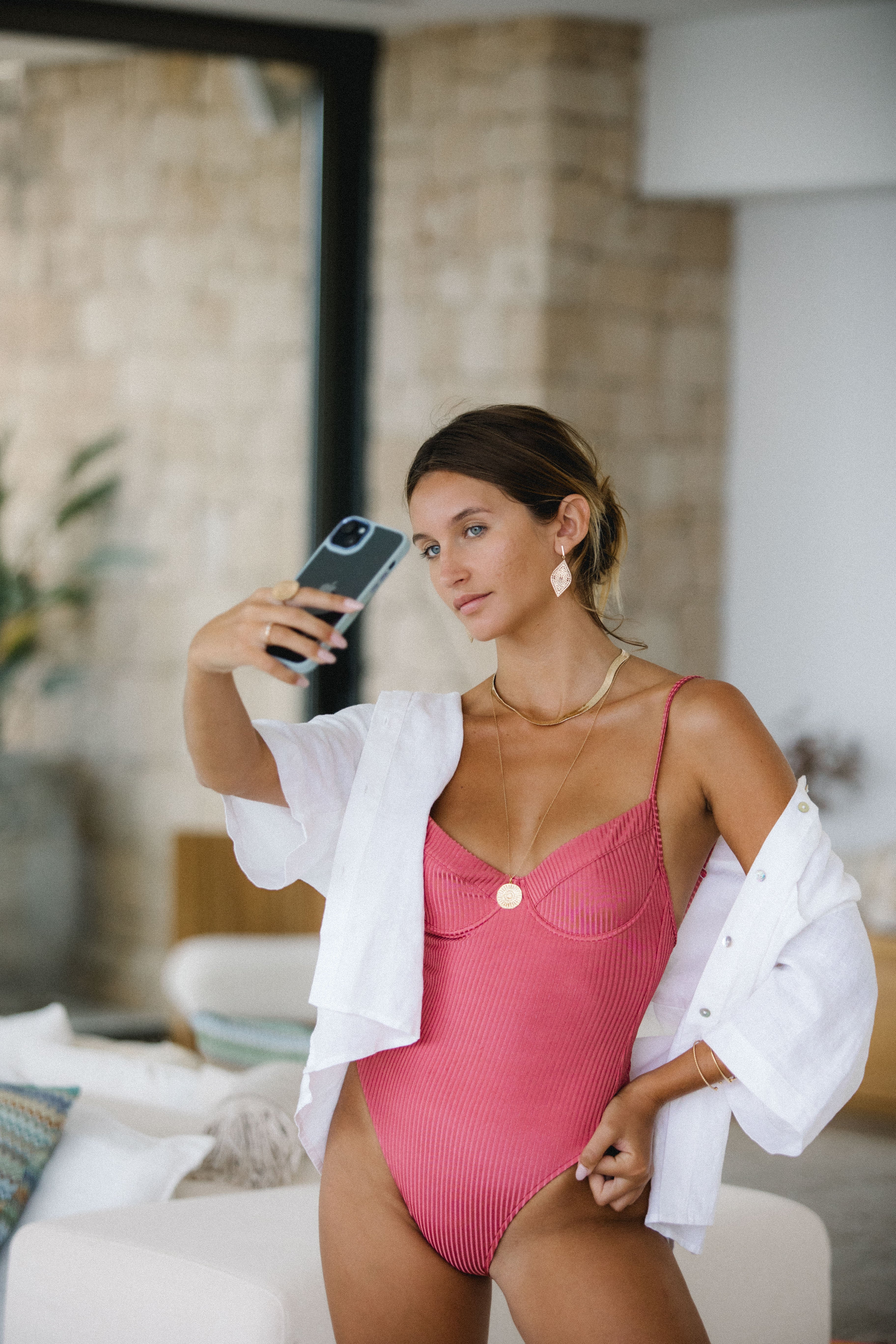 Bañador con aros formato corsé con tirante regulable.