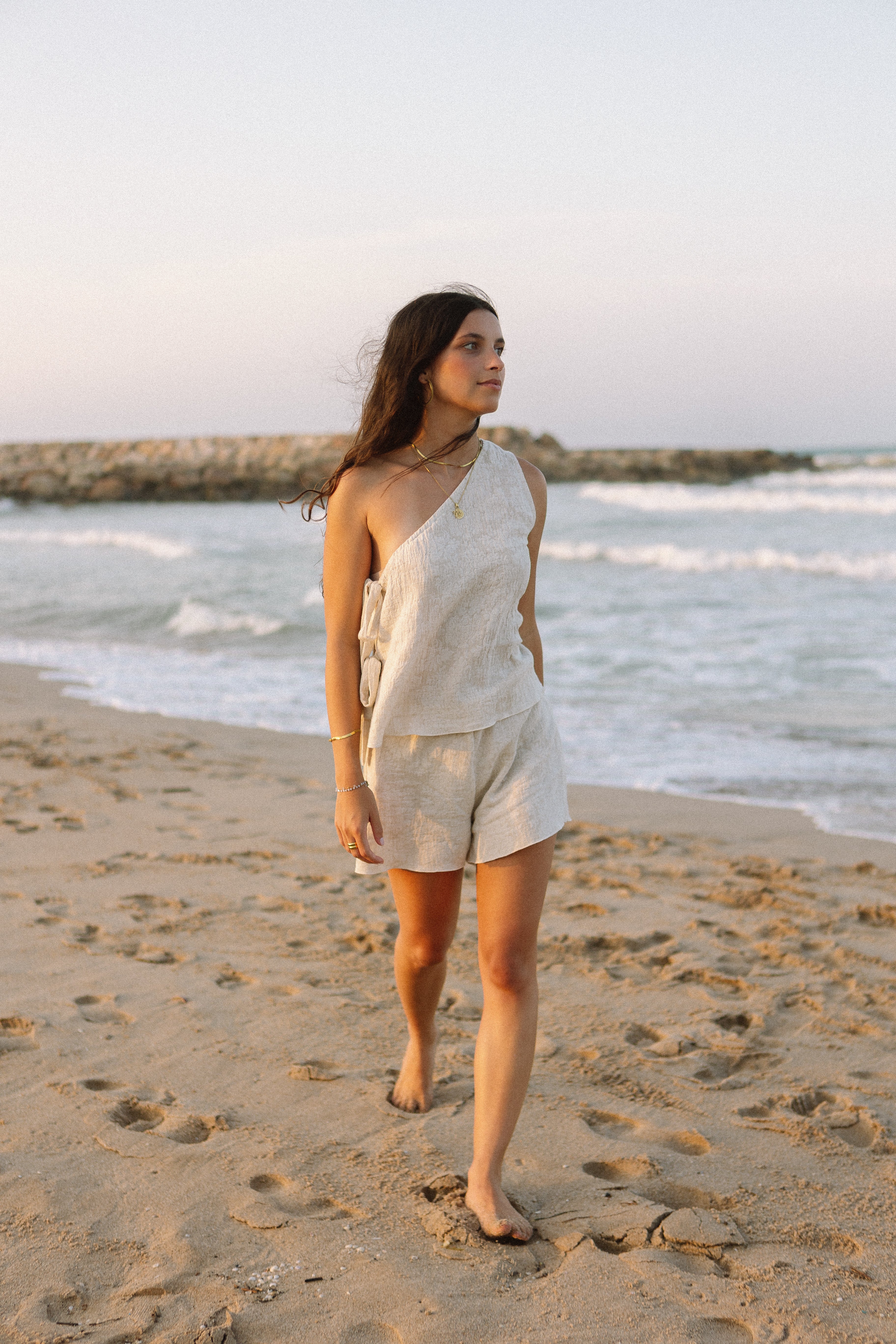 Vestido asimétrico de bambula con manga ancha, diseño fluido y elegante. Perfecto para los días cálidos por su comodidad y frescura.